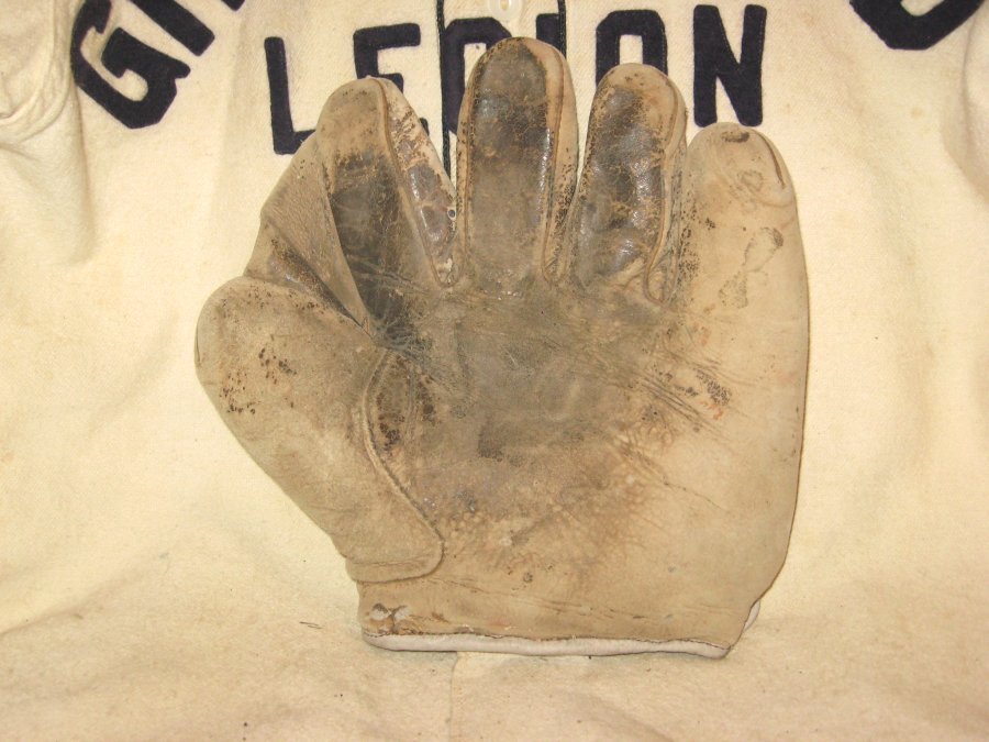 | Rochester Athletic Goods | ? | ? | Vg | This ca. 1910s FULL-WEB white glove has a very cool vibe. Any stampings are long gone, but under a jeweler's loupe, the tag reads "Rochester Athletic Goods" or something. SUPER soft, has been relined by the Glove Doctor years ago. What you can't see well in the pics is that there is a small hole (looks punched) through the inside edge of the index finger, and a split at the top of the same finger. BUT - neither of which affect the look at all, and it really feels GREAT on the hand, and looks very cool - take it to the ball game for some fun conversation! | SOLD | |